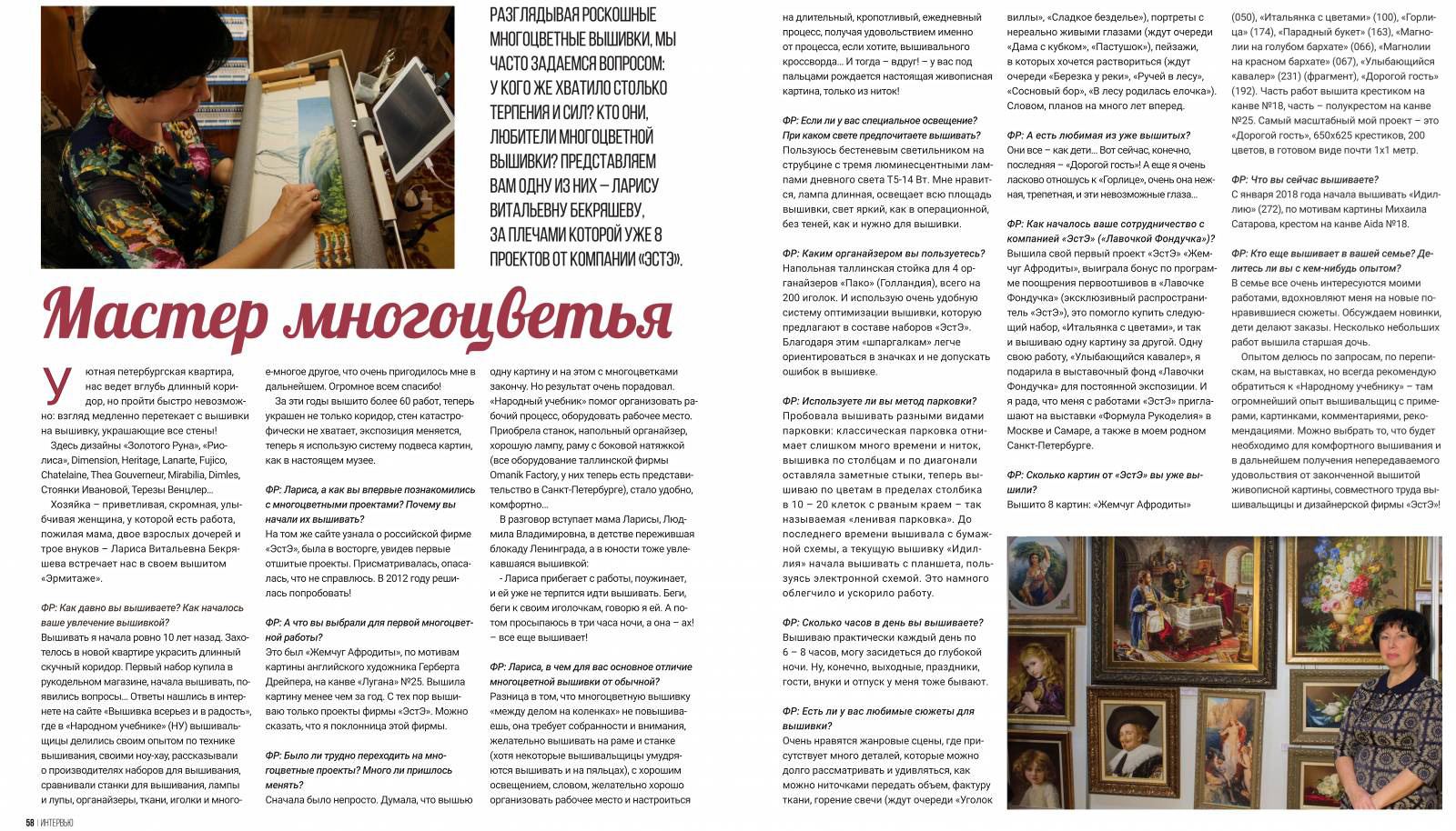 Еще на весенней выставке в Москве редакторы журнала "Формула рукоделия" были поражены вышивкой Ларисы (ЛаВи) 192 Дорогой гость. Узнали, что у Ларисы Витальевны уже 8 картин ЭстЭ, и попросили поподробнее познакомить читателей журнала с замечательной вышивальщицей: