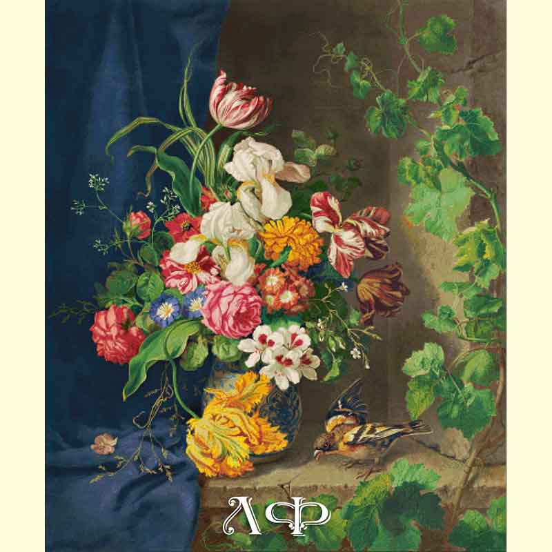 1040 Натюрморт с цветами, воробьём и виноградной лозой